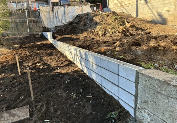 解体工事に伴い既存と石積みの擁壁を解体して新たにCB塀を新設しました。特殊な現場でしたが綺麗に...